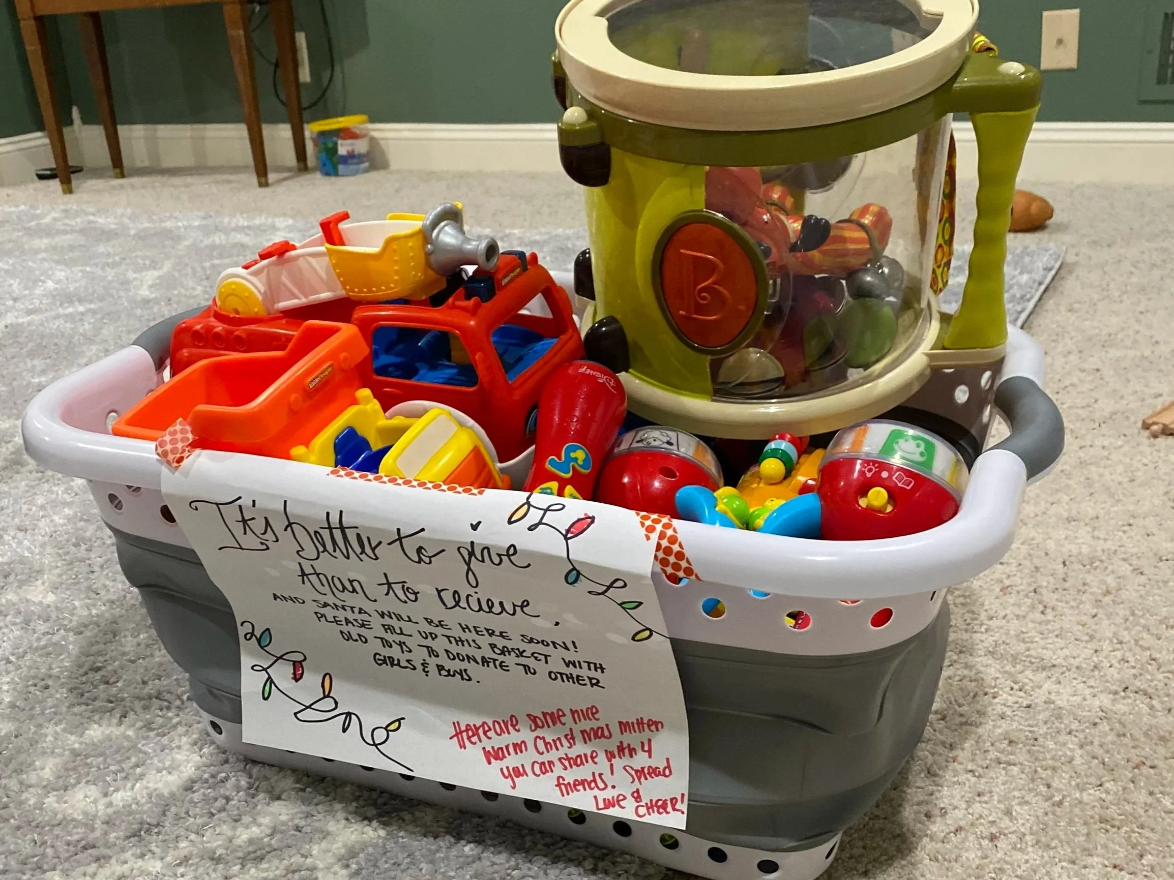 “It’s better to give than to receive, and Santa will be here soon! Please fill up this basket with old toys to donate to other girls & boys. On Christmas morning Santa will be sure to bring you something shiny and new!”